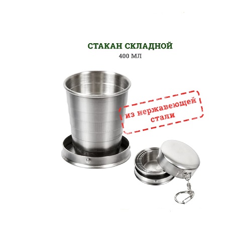 Стакан изготовлен из нержавеющей стали, устойчивой к механическим повреждениям. Он удобен в хранении и при помощи карабина легко пристегивается к ремню или рюкзаку.