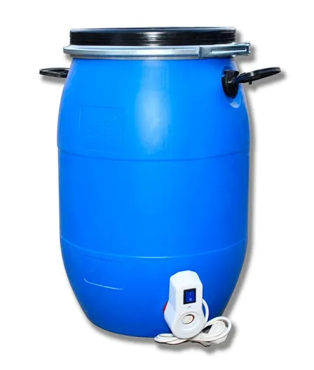 Нагревательный элемент, идущий в комплекте с бочкой, рассчитан на напряжение питающей сети и имеет мощность два киловатта и оснащён регулятором температуры (иначе термостатом), который имеет рабочий температурный диапазон от 40 до 80°С с максимальной погрешностью в 5 градусов. Полный объём воды нагревается до температуры 40°С за два часа. Вся конструкция пустой бочки весит пять кг.