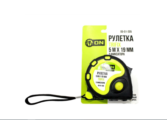 Рулетка ON TRIFIX 5м х 19мм, обрезиненный корпус, 3 фиксатора 05-01-205 удобна при работе одной рукой.