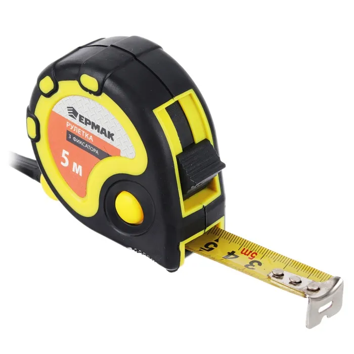 Рулетка ЕРМАК 3 фиксатора, двукомпонентный корпус, 5м х 19мм 658-125 предназначается для проведения измерительных работ. Надежный сматывающий механизм и корпус из ударопрочного пластика обеспечивают долгий срок службы инструмента.
