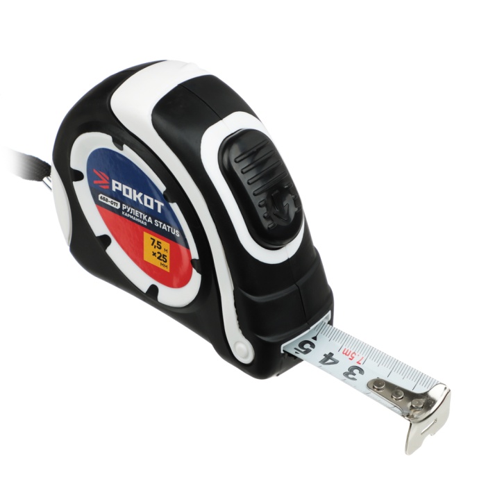 Карманная рулетка РОКОТ STATUS автостоп, 7,5мх25мм 658-011 подходит для определения расстояний и длины деталей. Металлическая лента окрашена, имеет четкую разметку.