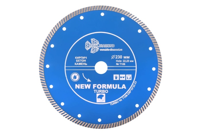 Особенности: диск с рифленой кромкой имеет более чистый и аккуратный по сравнению с сегментными дисками рез. За счет турбированной кромки увеличивается скорость реза, отверстия на теле диска способствуют лучшему охлаждению и продлевают срок службы. Подходит для сухого и мокрого реза.