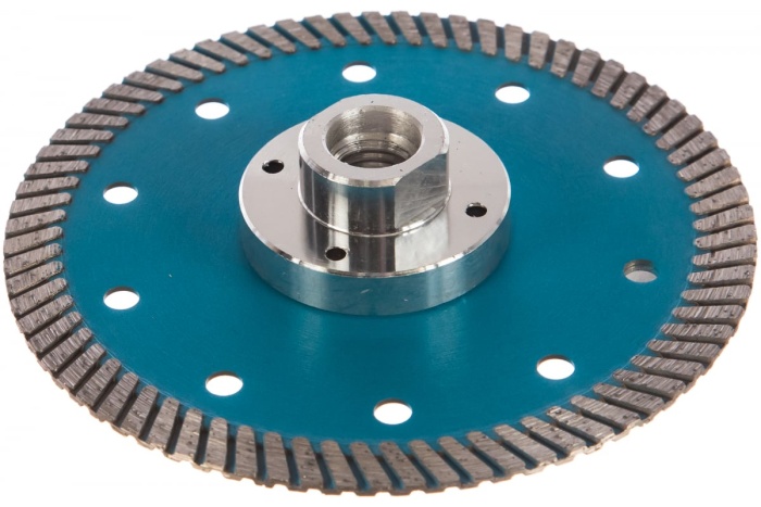 Особенности: фланец М-14 не только позволяет устанавливать данный диск на УШМ без зажимной гайки, но и значительно усиливает корпус диска, что дает возможность работать с материалом под любым углом, создавая дополнительные возможности в работе.