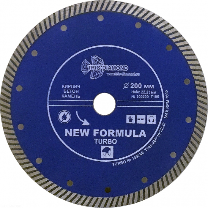 Алмазный диск Trio Diamond Турбо New Formula 200 мм - изготовлен методом холодного прессования. Диск используется для резки армированного бетона, бетона, кирпича, огнеупоров, камня, песчаника и бордюрного камня. Толщина алмазного слоя 2,8 мм, а высота 10 мм. Посадочное отверстие - 22,23 мм. Глубина реза составляет 60 мм. Рифленая кромка обеспечивает чистый рез без сколов. Отверстия на диске способствуют лучшему охлаждению и продлевают срок службы. Резка осуществляется как с применением водяного охлаждения, так и без. Диск подходит для работы на УШМ. Особенности