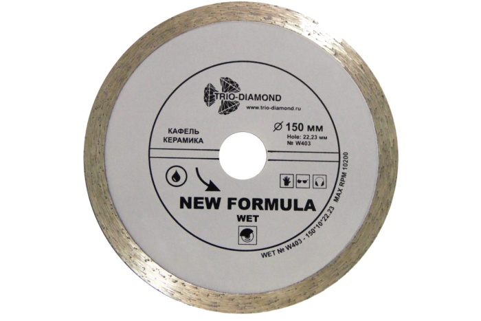Особенности: диск со сплошной режущей кромкой, для влажной резки. Обеспечивает гладкий рез без сколов. Применяется при резке низко абразивных материалов.