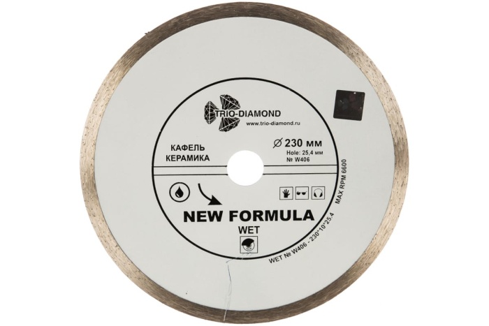 Особенности: диск со сплошной режущей кромкой, для влажной резки. Обеспечивает гладкий рез без сколов. Применяется при резке низко абразивных материалов.