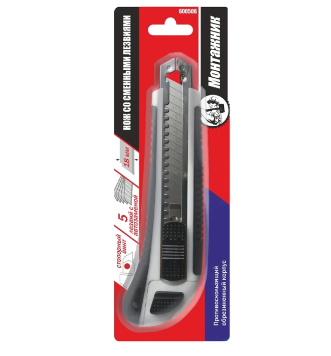 —Нож с сегментным лезвием 18мм ,обрезиненный, ABS+TPR,5 лезвий с автозаменой"Монтажник"