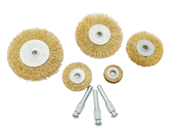 Набор металлических щеток включает в себя полезный комплект для работы. Шпильки позволяют устанавливать их на дрель для удаления побелки или краски.