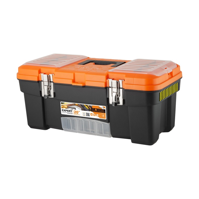 Ящик для инструментов с металлическими замками рассчитан на повышенные нагрузки. Хранение инструментов в ящике защищает их от пыли и грязи. Наличие ручки позволяет переносить инструменты на место выполнения работ. Съемный внутренний лоток позволяет отделить инструменты и аксессуары первой необходимости от основного отсека. Крышка ящика оснащена органайзерами для хранения мелочей.