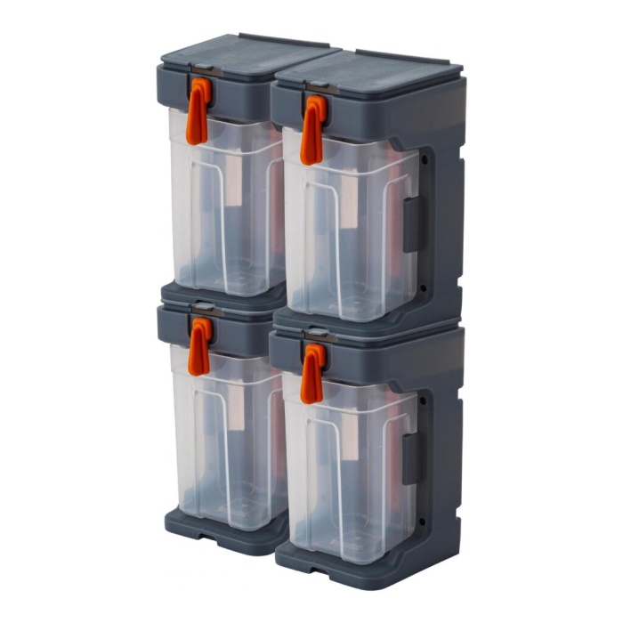 Конструкция позволяет создавать систему хранения, скрепляя однотипные лотки друг с другом.