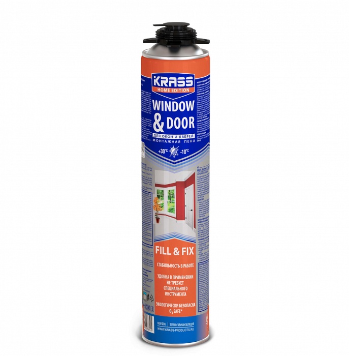 Свойства KRASS Home Edition для окон и дверей пистолетная: Проста и удобна в применении. Обеспечивает превосходную акустическую и тепловую изоляцию, не деформируя оконный профиль. Проникает в самые труднодоступные полости, быстро затвердевает.