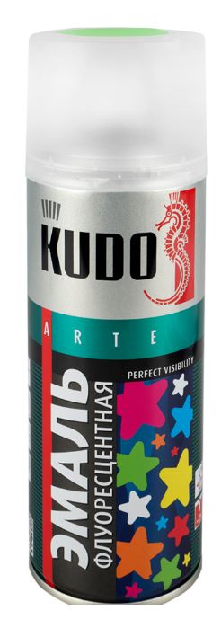 При нанесении специальная эмаль со светоотражающей способностью светится в темноте. Помогает сделать заметными на дороге дорожные знаки или, например, самокаты. Подходит для создания предупредительных и сигнальных эффектов на технике, станках, ступенях, элементах ограждений. Флуоресцентная аэрозольная краска KUDO дает безграничный простор творческой фантазии, поэтому популярна у художников для оформительских работ и декоративного окрашивания. При ультрафиолетовом облучении интенсивность свечения эмали увеличивается.
