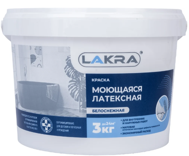 —Краска латексная моющаяся белая матовая 3кг ЛАКРА