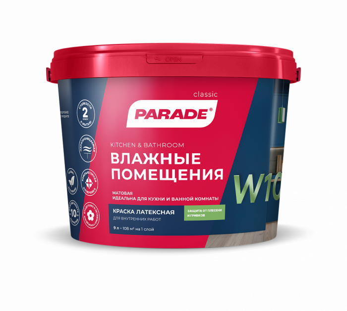 Краска латексная PARADE W100 Влажные помещения база А 9 л  - акриловая водно-дисперсионная белая матовая краска. Образует прочное матовое влагостойкое паропроницаемое покрытие, выдерживающее частую влажную уборку. Обладает высокими декоративными свойствами, отличной укрывистостью и прочным сцеплением с основанием.