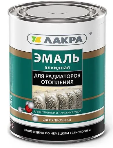 Алкидная эмаль для радиаторов Лакра белая, полуматовая, 0.9 кг  используется для окрашивания труб водоснабжения, обладает защитными и декоративными свойствами. Покрытие характеризуется термостойкостью, влагостойкостью, прекрасной укрывистостью и сцеплением с поверхностью.