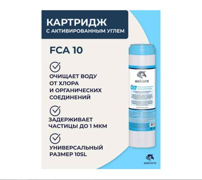 Картридж с активированным углем FCA 10" предназначен для сорбционной очистки воды от хлора, органических соединений, улучшает органолептические показатели воды (вкус, запах, цвет). Надёжно очищает воду от хлора и его соединений, пестицидов, гербицидов и других тригалогенметанов, механических примесей размером более 1 мкм. Устраняет мутность и неприятный запах, улучшает вкус воды, при этом сохраняя природную структуру воды и полезный минеральный состав.