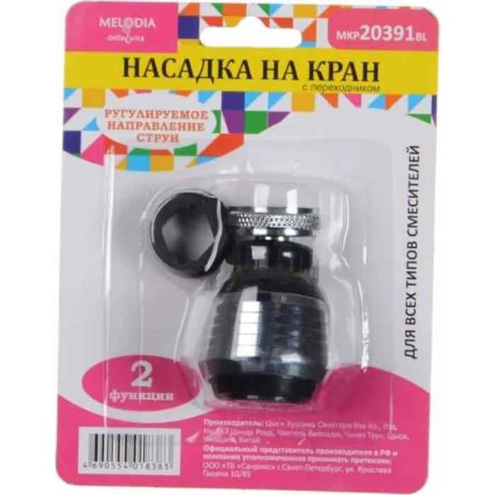 Аэратор для смесителя MELODIA пластик М22хМ24 2 функции, пластиковая сетка, черный MKP20391BL 33991 предназначен для насыщения воздухом водной струи, выходящей из смесителя.