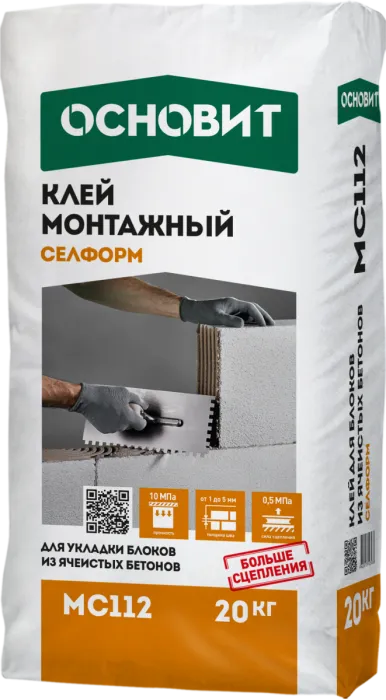 Клей монтажный Основит Селформ МС112 предназначен для кладки стен и перегородок из блоков и плит на основе ячеистого бетона (пено- и газобетон), газосиликата и силиката.